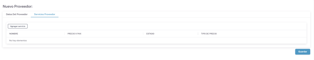 Al terminar le daremos en Guardar. Ahora nos dirigiremos a la secunda pestaña que sera para agregar el Servicio de ese proveedor. Debemos darle en Agregar Servicio. Los datos que tenemos que llenar son Nombre – Precio X Pax – Estado – Tipo de precio