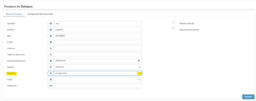 Ahora en la ventana veremos los datos del pasajero veremos un listado con los datos del pasajero y vamos a buscar Contrato. Veremos que tiene puesto el contrato actual, le haremos click en esa barra y vamos a seleccionar el nuevo contrato al que lo queremos transferir.